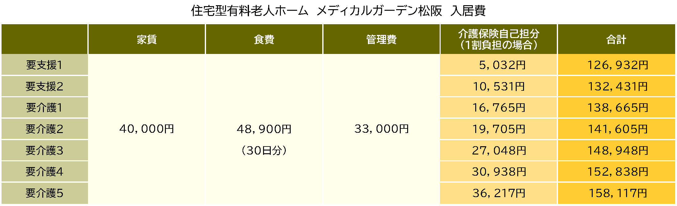 上表の介護保険自己負担分は1割負担の場合の費用となっております。所得状況に応じ2~3割負担となる場合もございます。